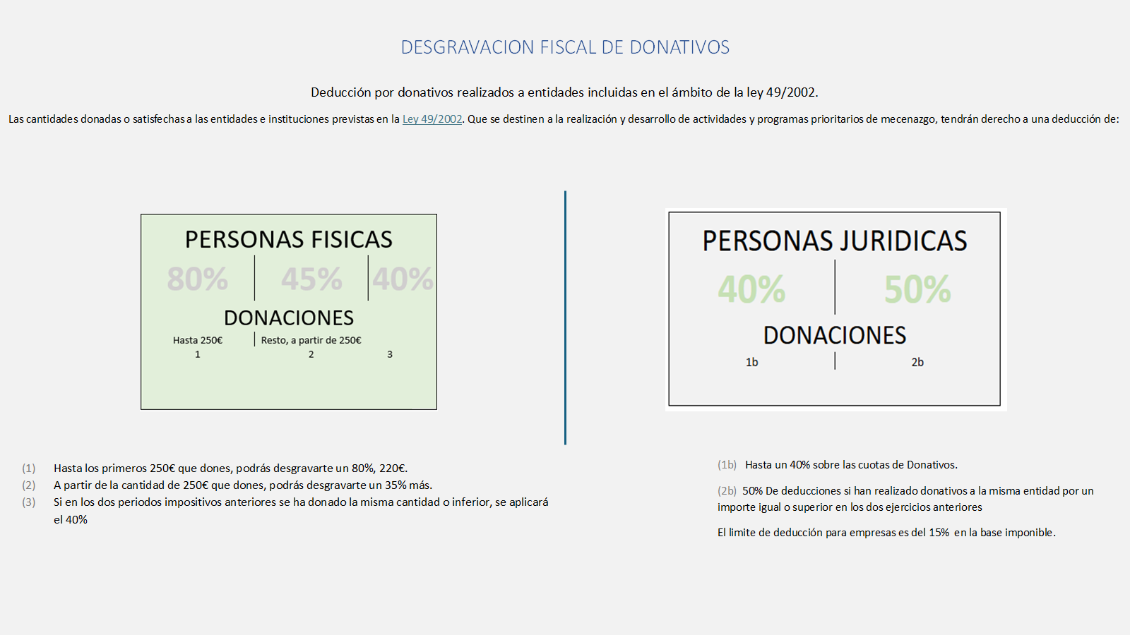 - Los 50 € restantes se deducen al 40% (20 €) o al 45% (22,5 €), según tu historial de donaciones.